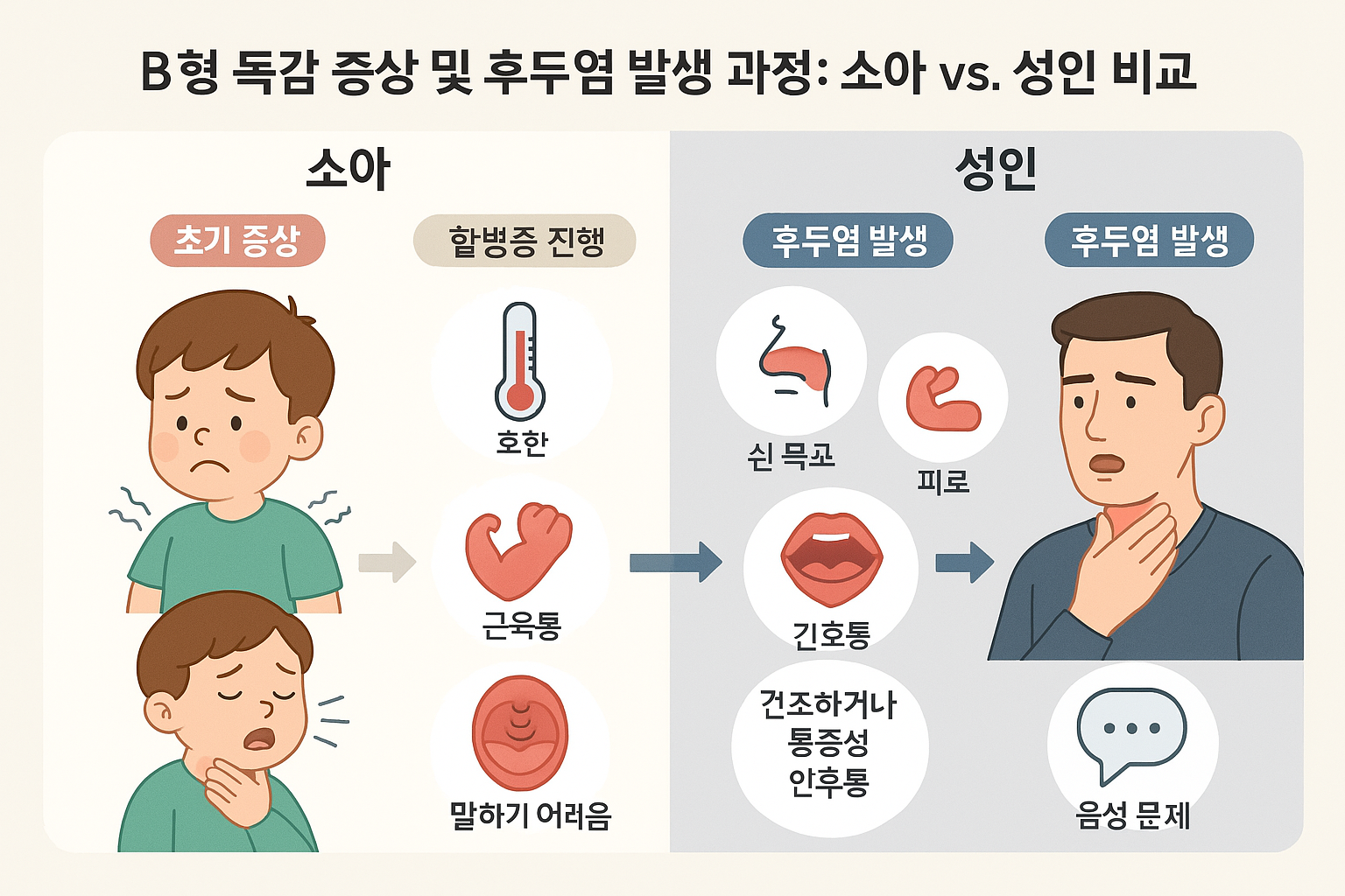 특히 B형 독감은 후두염(목이 붓고 쉬는 증상)으로도 발전할 수 있어요. 독감 바이러스가 후두 부위를 자극하면서 염증이 생기는 거죠. 아이가 갑자기 목소리가 잠기거나, 기침할 때 목이 아프다고 하면 후두염일 가능성이 크니까 잘 살펴보세요!