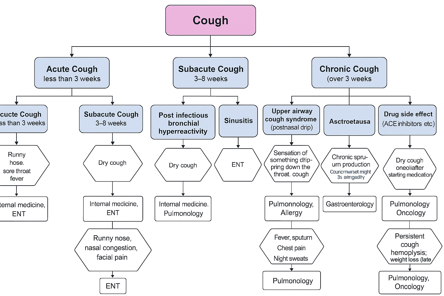 3. 만성 기침 (8주 이상)인 경우, 동반되는 주요 증상에 따라 전문적인 진료과를 선택하는 것이 중요합니다.