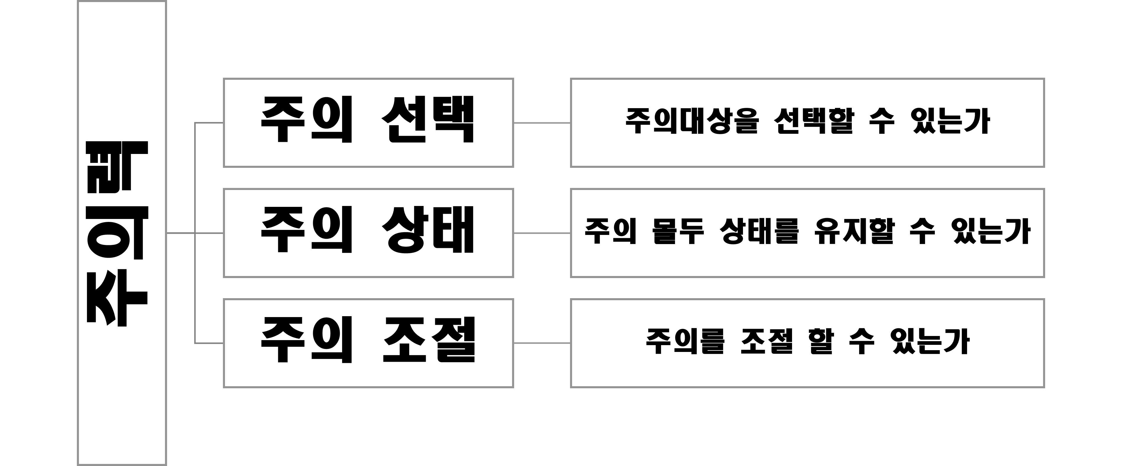 주의 선택, 주의 상태, 주의 조절의 3가지 요소가 원활하게 작동해야 아이의 주의력이 충분히 그 능력을 발휘할 수 있다고 합니다.
