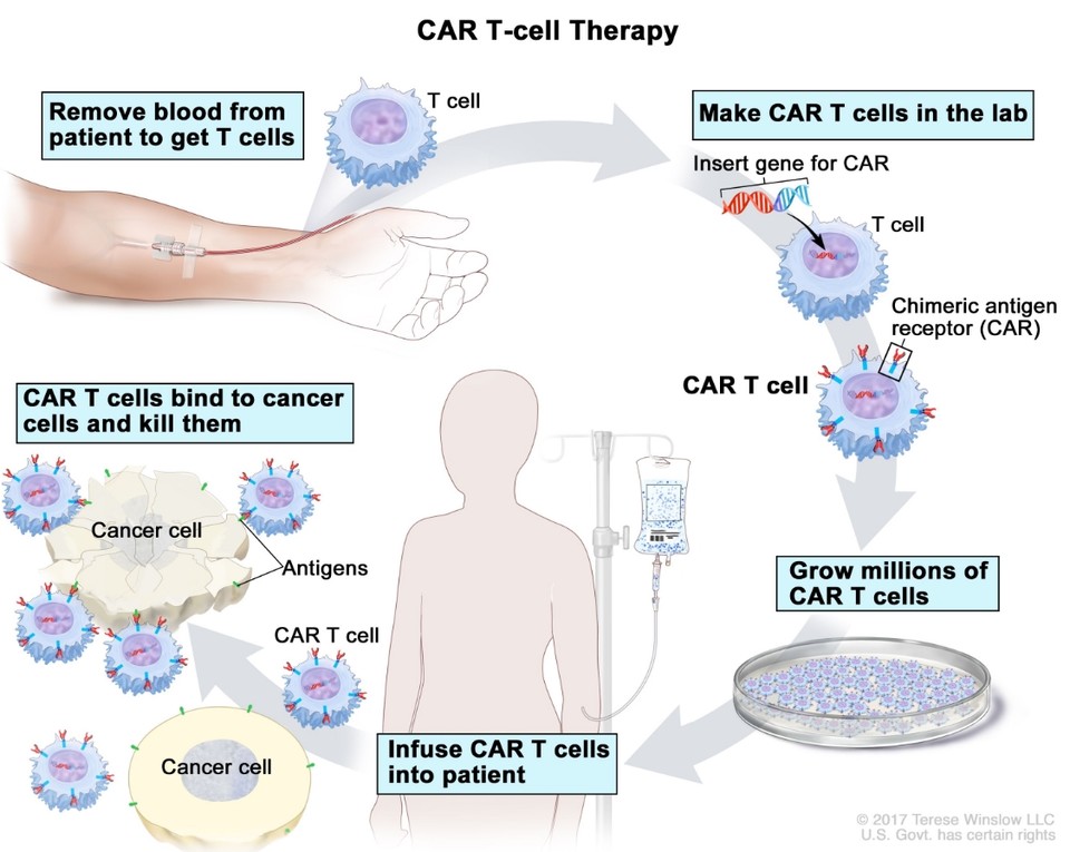 CAR-T 치료는 환자의 T세포를 꺼내서 유전적으로 개조하고, 다시 체내에 넣는 면역 세포 치료입니다. 맞춤형 암 치료죠. 특히 기존 치료에 반응하지 않는 혈액암 환자에게 아주 높은 효과를 보여주고 있어요!