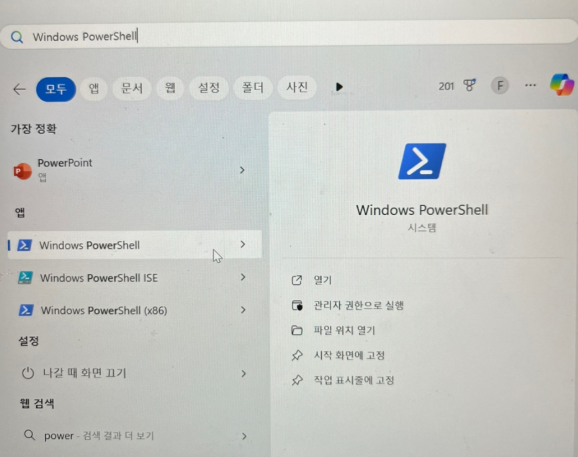 파워쉘(Windows PowerShell)은 마이크로소프트에서 개발한 명령 줄 셸과 스크립팅 언어입니다. 일단 윈도우 파워쉘을 열어 보겠습니다.